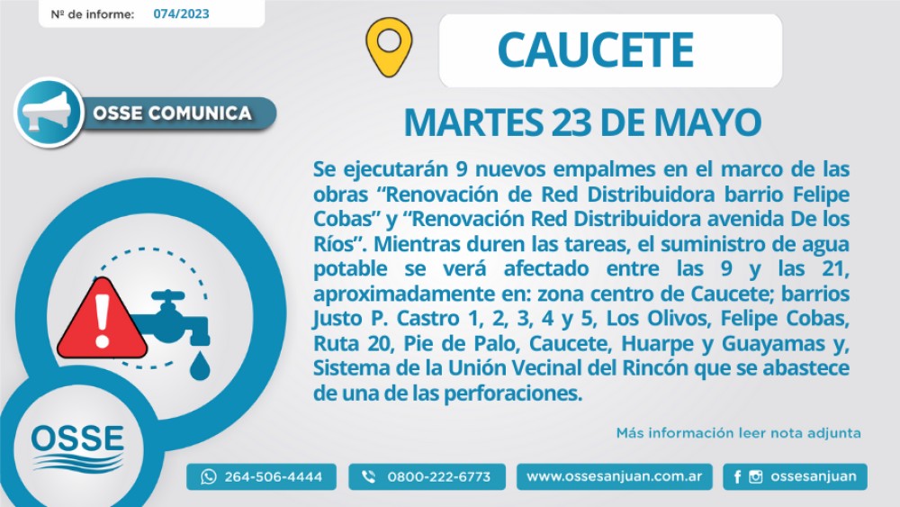 Como parte de los trabajos programados en el marco de las obras “Renovación de la Red Distribuidora barrio Felipe Cobas” y “Renovación Red Distribuidora avenida De los Ríos” que se vienen ejecutando en Caucete para optimizar el servicio de agua potable, equipos del Departamento Obras de OSSE, realizarán obras de conexiones a la red existente.