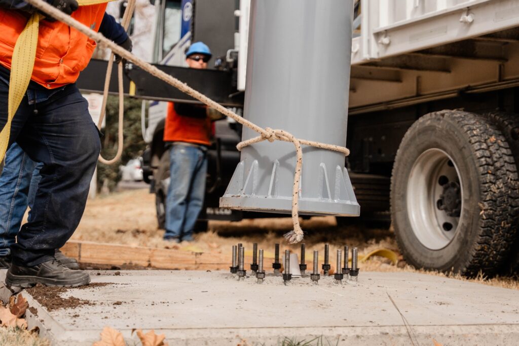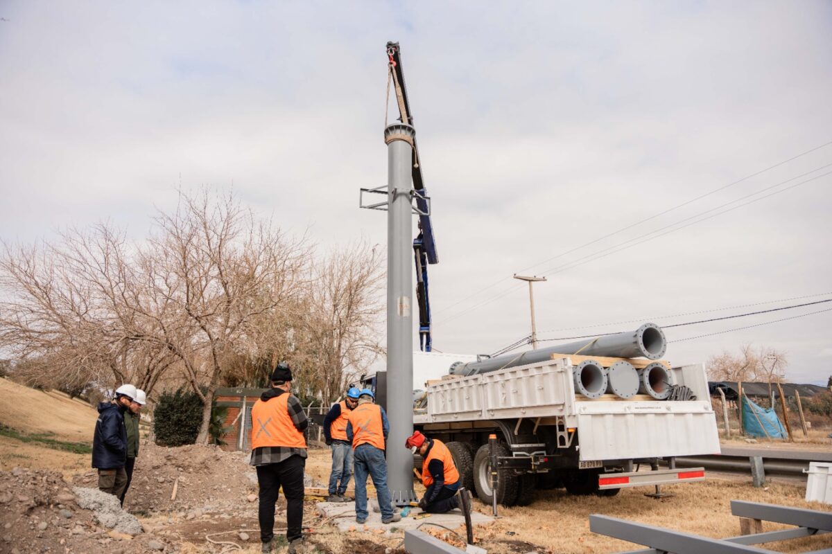 Luego de estas tarea, comenzó la instalación de los primeros seis monopostes. Estas columnas metálicas, de 6,20 metros de altura, 40 centímetros de diámetro y 638 kilogramos de peso, se amuraron sobre bases de hormigón (dados) de 2 metros de lado por 2 de profundidad. Algunas de estas bases ya se encuentran finalizadas y otras, en ejecución.