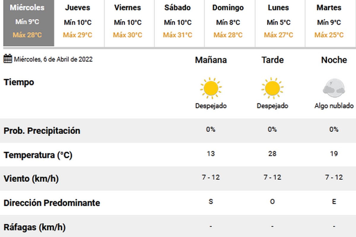 Desde el Servicio Meteorológico Nacional anunciaron para hoy, miércoles 6 de abril de 2022, una temperatura máxima de 28 grados aproximadamente mientras que la mínima rondaría los 9. Además el cielo se encontraría despejado por la mañana y la tarde y algo nublado a la noche. Finalmente cabe destacar que el viento sería de dirección […]